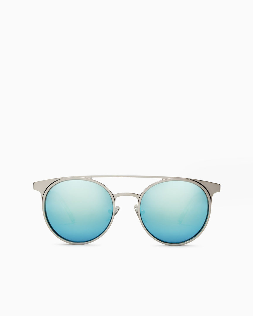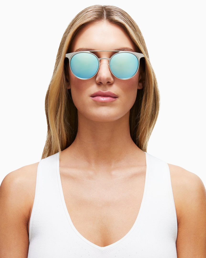 Reflect your Cali style in our mirrored Malibu shades. Featuring oval frames with a flattering double bridge design, these shades will instantly conjure a Hollywood mindset and Sunset Strip strut. The silver frame and ice blue reflective lenses are complemented by black acetone tips, while the engraved logo on both temples add some special flair.