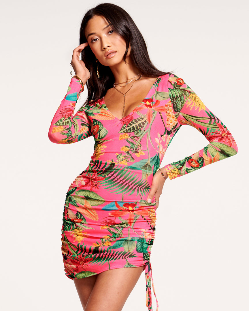 Channel Miami heat in our Exclusive Sarabeth Dress, a sexy bodycon crafted in our curve loving printed mesh. Designed with botanical details that give island vibes, this long sleeve, v-neck mini has an adjustable side detail so you can lift or lower to achieve your desired length. We recommend pairing with gold strappy stilettos but with a look this hot, you can do no wrong.