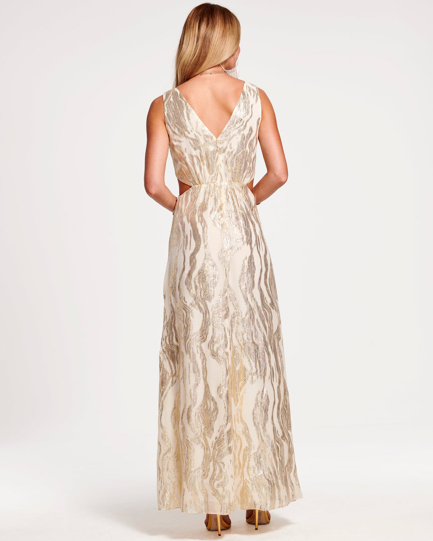 Come on, Irene! The floor length, modern design of our Irene Dress will have you looking for an occasion to wear it. Statement making with the luxe party jacquard fabrication, the plunging neckline and side cut outs, simply strut through a room and watch heads turn.