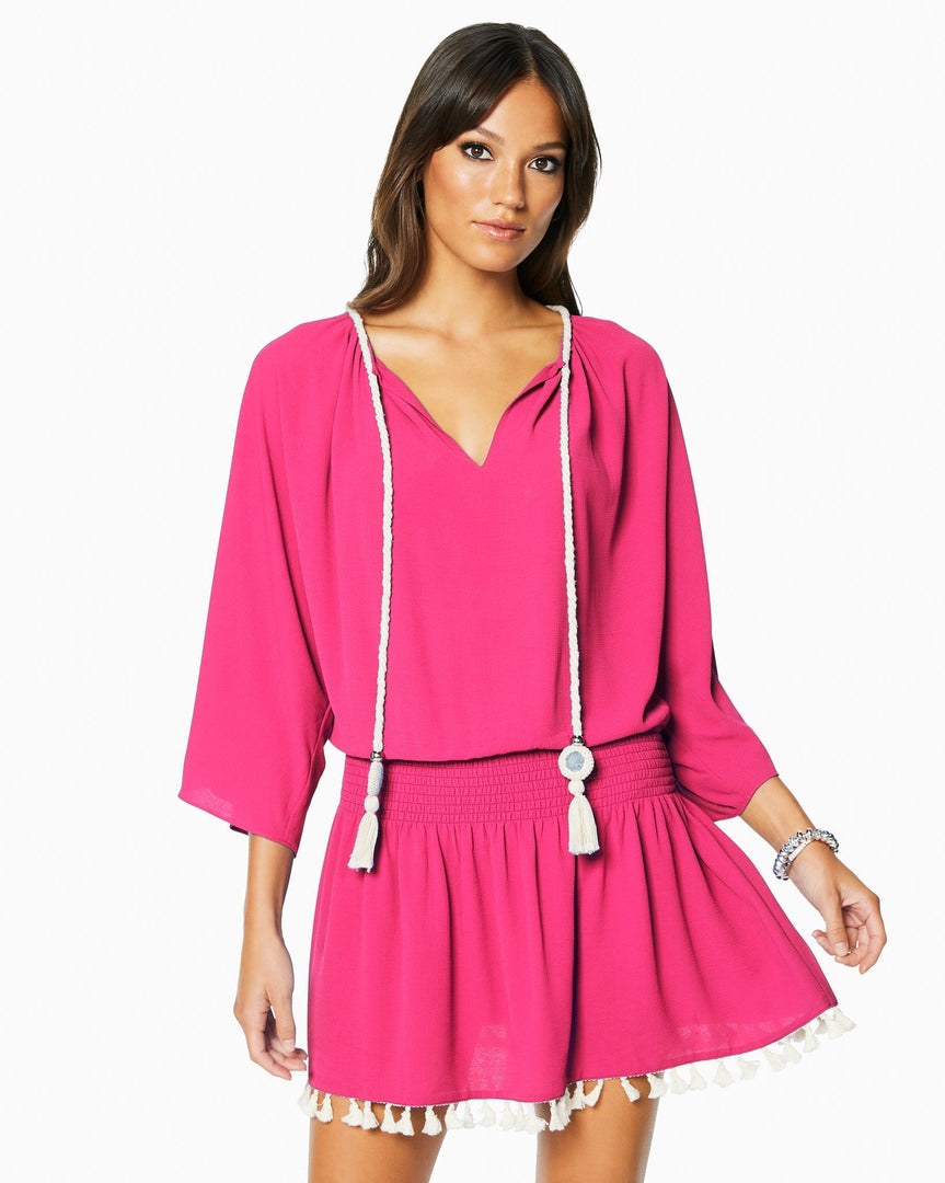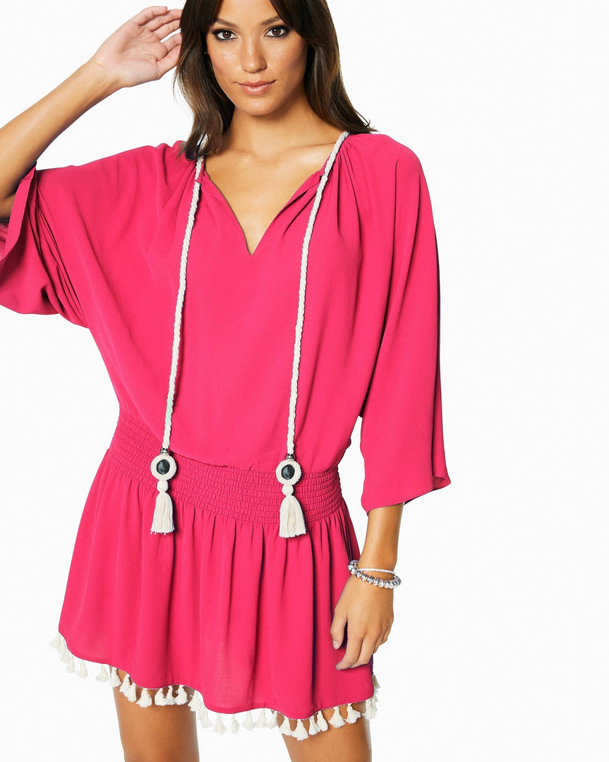 Dress for the sea breeze in the stunning Katana Dress. The oversized top and sleeves keep you cool even in the sun while providing extra coverage, while the cinched waist and mini dress length ensure you always feel free to move. We love the tropical embellished neck tie closure and tassel hemline detailing – it’s totally tropical!