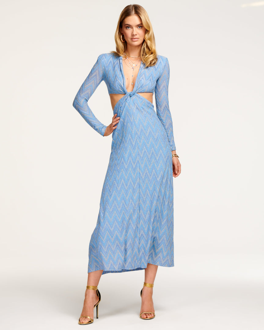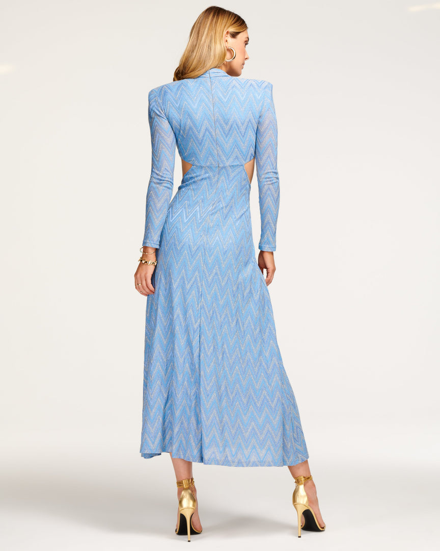 Make a statement in any room in our Celesete Dress, which offers the best of a power shoulder and impactful cut outs, enhanced with a multi tonal chevron print. Pair with your favorite stilettos and stand tall in this stunning maxi dress.